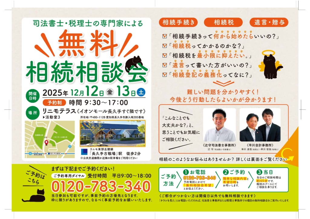 2025年12月12日㈮~13日㈯の2日間、長久手市のリニモテラス(イオンモール長久手すぐ隣)において、司法書士の辻守先生とともに相続無料相談会を開催します。